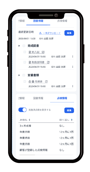 製品の出荷時に完成図書や推奨点検時期などの情報が既に登録されているので、従来のシステムのような